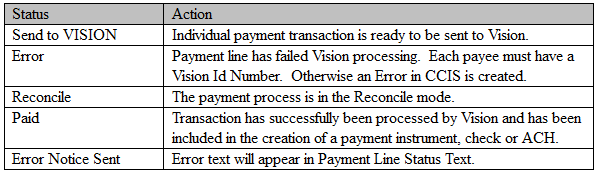 Every payment must have an entity to be paid and that entity must have a Vision Vendor ID in order for payment to be generated by Vision. The payee may be a person or an organization. Payment Type identifies the category of payment to be made, such as child care, slots, grant, bonus, and fee. Payments to be made are always identified by their Payment Status of "Send to VISION." This status is automatically changed as the payment processor completes. These statuses are: