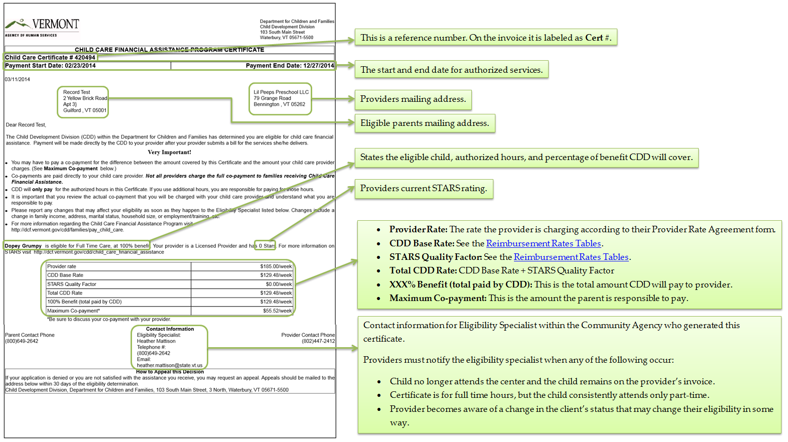 This certificate (also known as subsidy voucher) provides important information in regards to payment rates and eligibility dates, for each eligible child. It's important that a provider waits to provide child care services until after they have received this certificate. The certificates can be found under the Documents section of your Child Care Program Account.